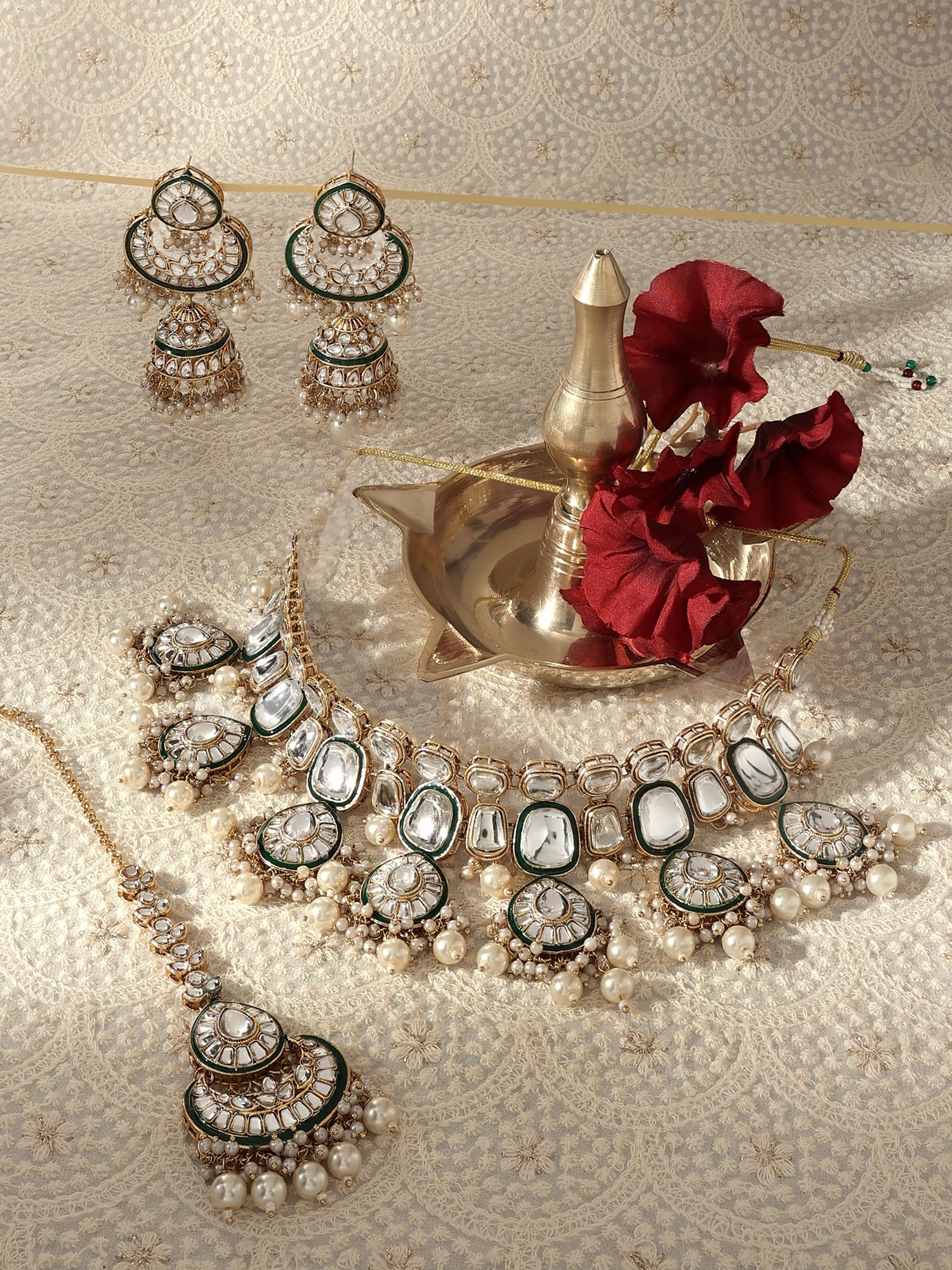 ZAVERI PEARLS Gold Tone & Green Enamel Kundan Artificial Stones & Pearls Drop Bridal Necklace Earring & Maangtikka Set For Women-ZPFK16933