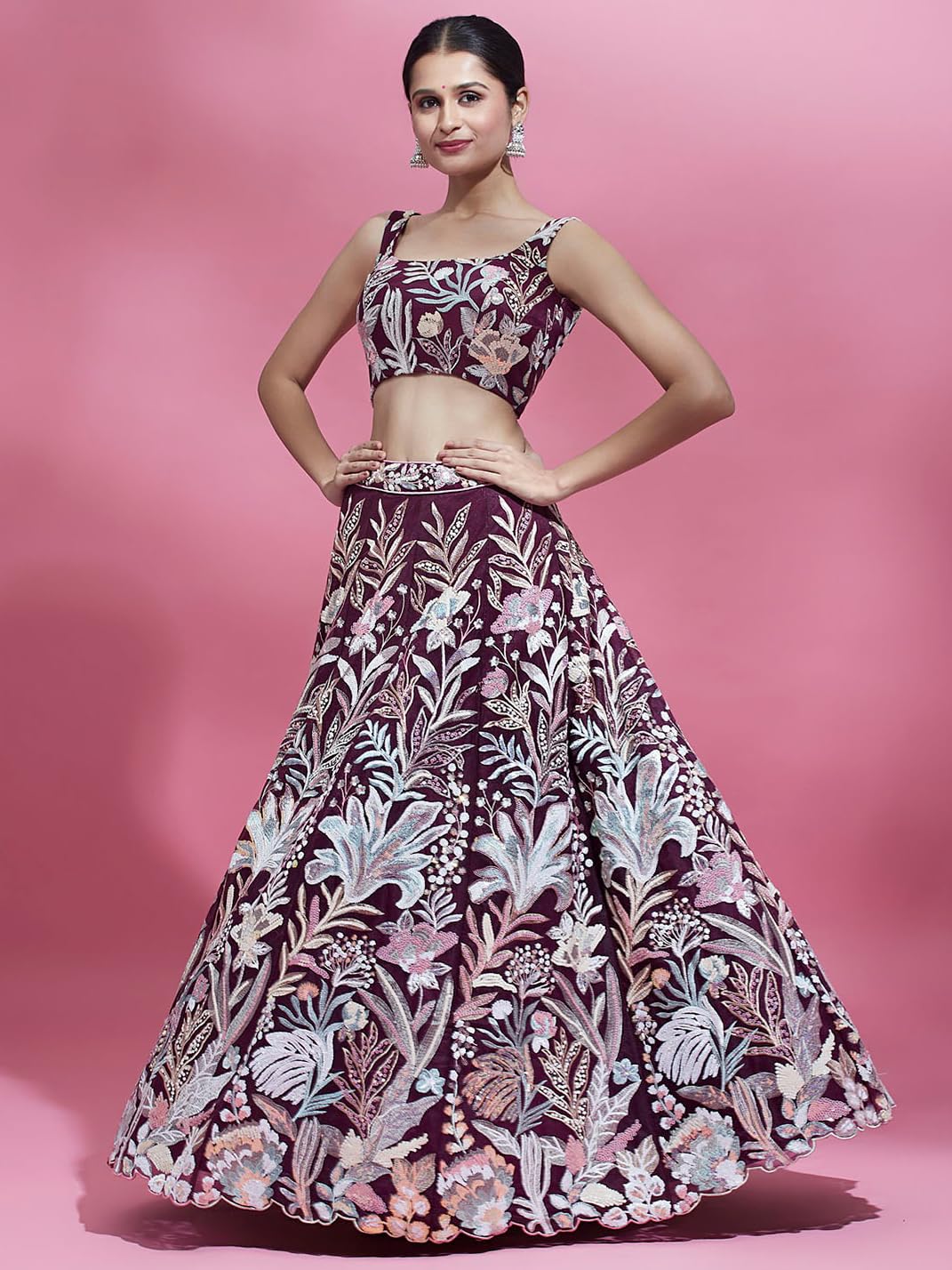 Zeel Clothing Women's Net Sequins Embroidered Soft Net Semi Stitched Lehenga Choli With Dupatta (6032-Wine-Wedding-Stylish-Lehenga-Choli-Latest; Free Size), Multicolor