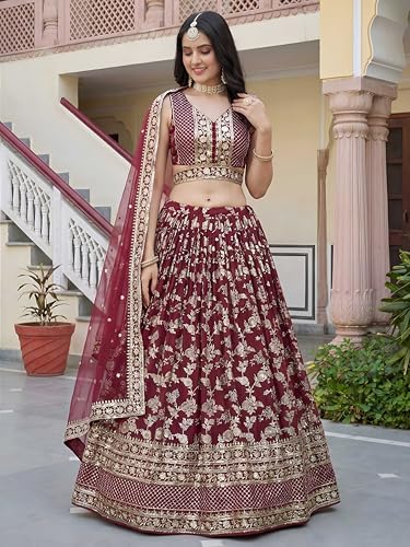 Zeel Clothing Women's Sequins Zari Embroidered Dola Silk Jacquard Lehenga Choli With Dupatta (7100-Maroon-Women-New-Lehenga-Choli, Free size) (Maroon)