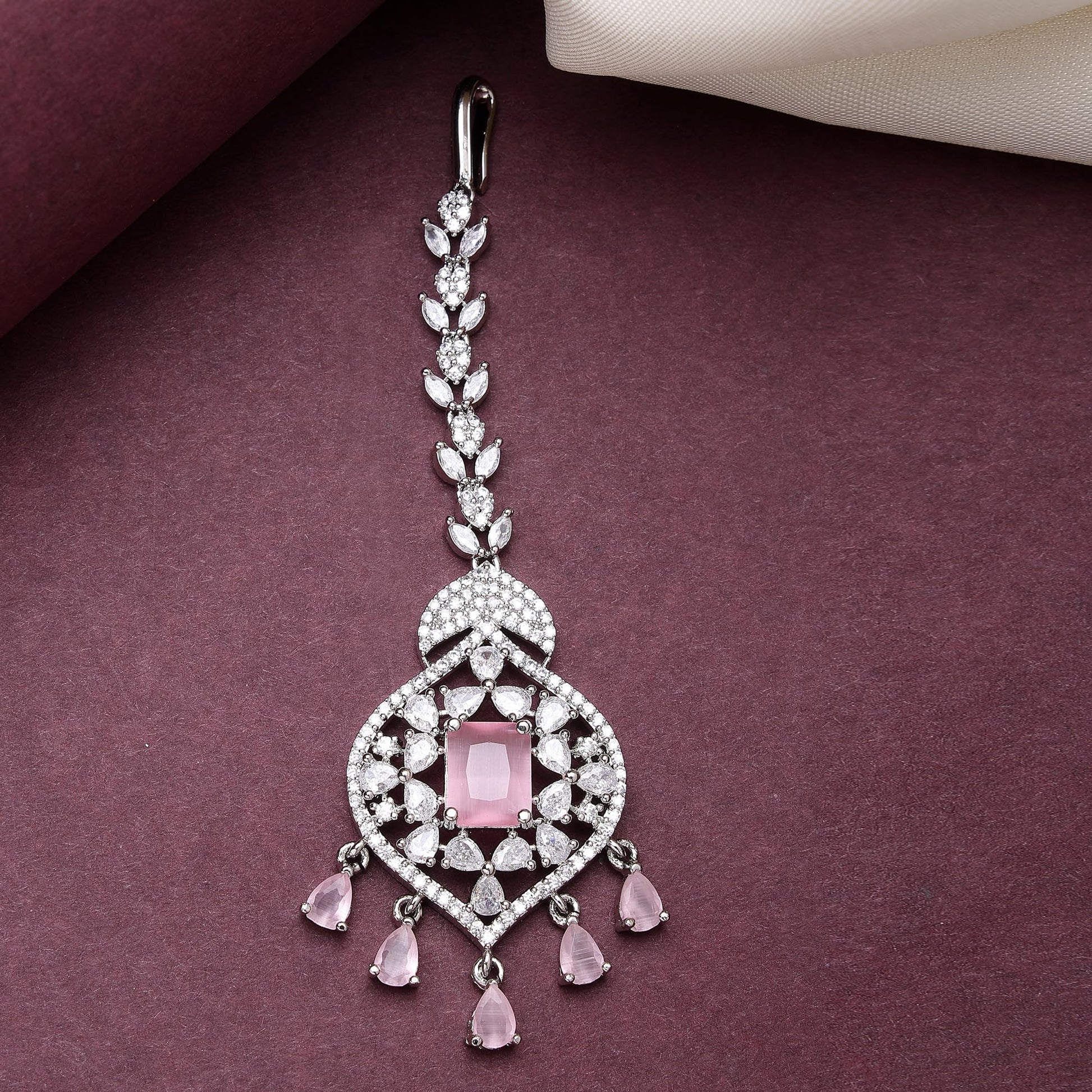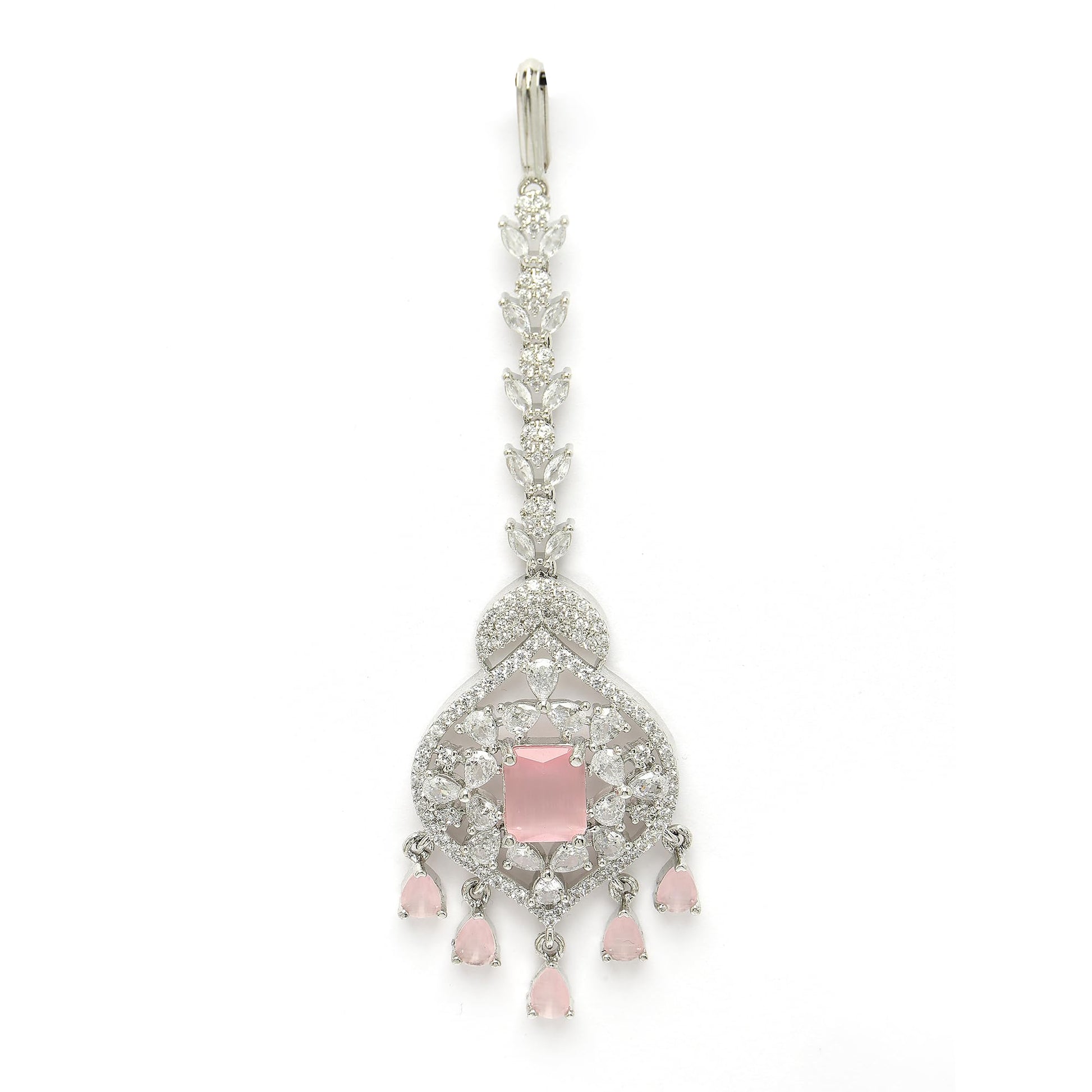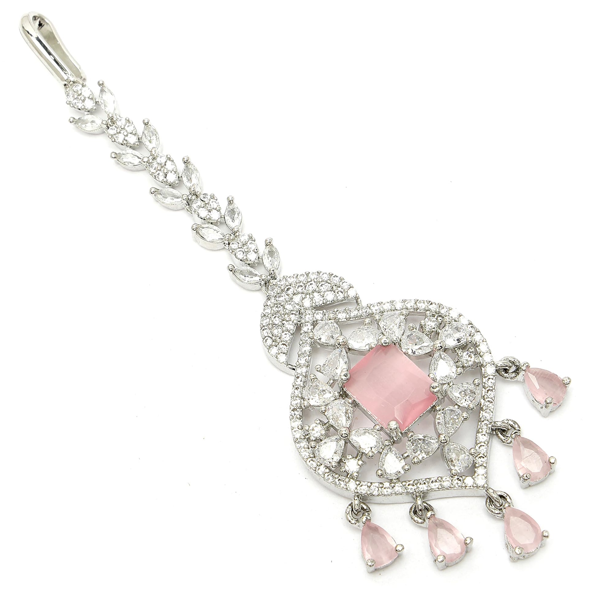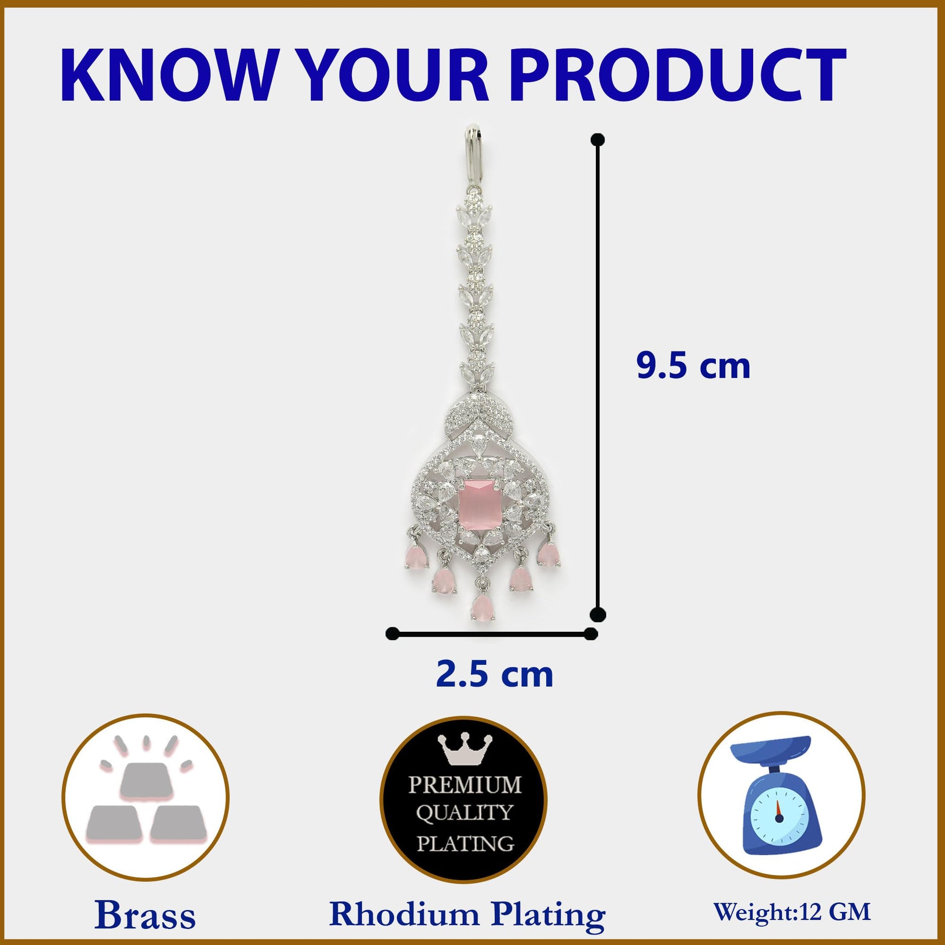 Zeneme Sparkling American Diamond Maang Tikka for Women | Elegant Floral Design Silver Plated Maang Tikka for Wedding - Traditional Head Jewellery for Women (Pink Moonbeam Charm Mangtika)