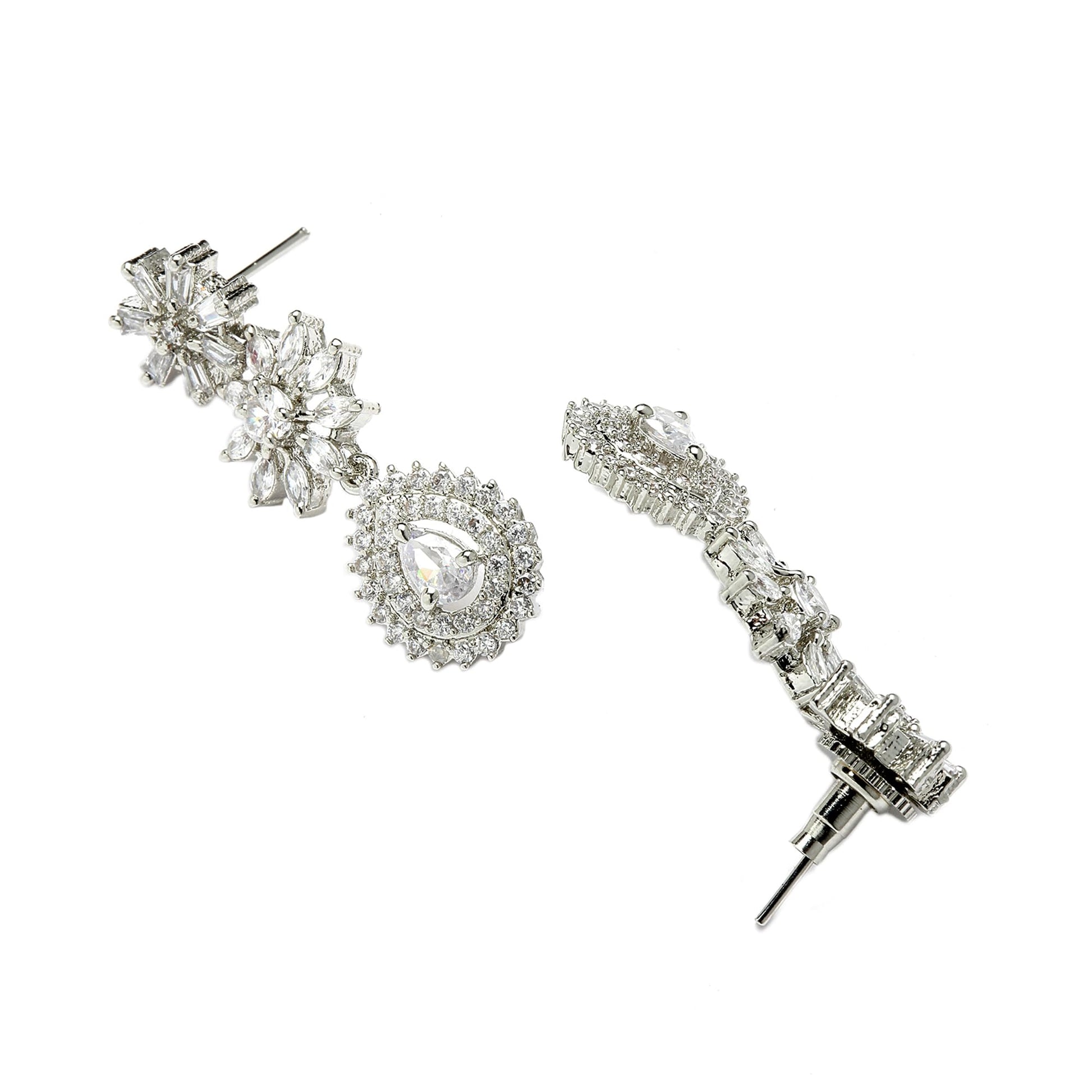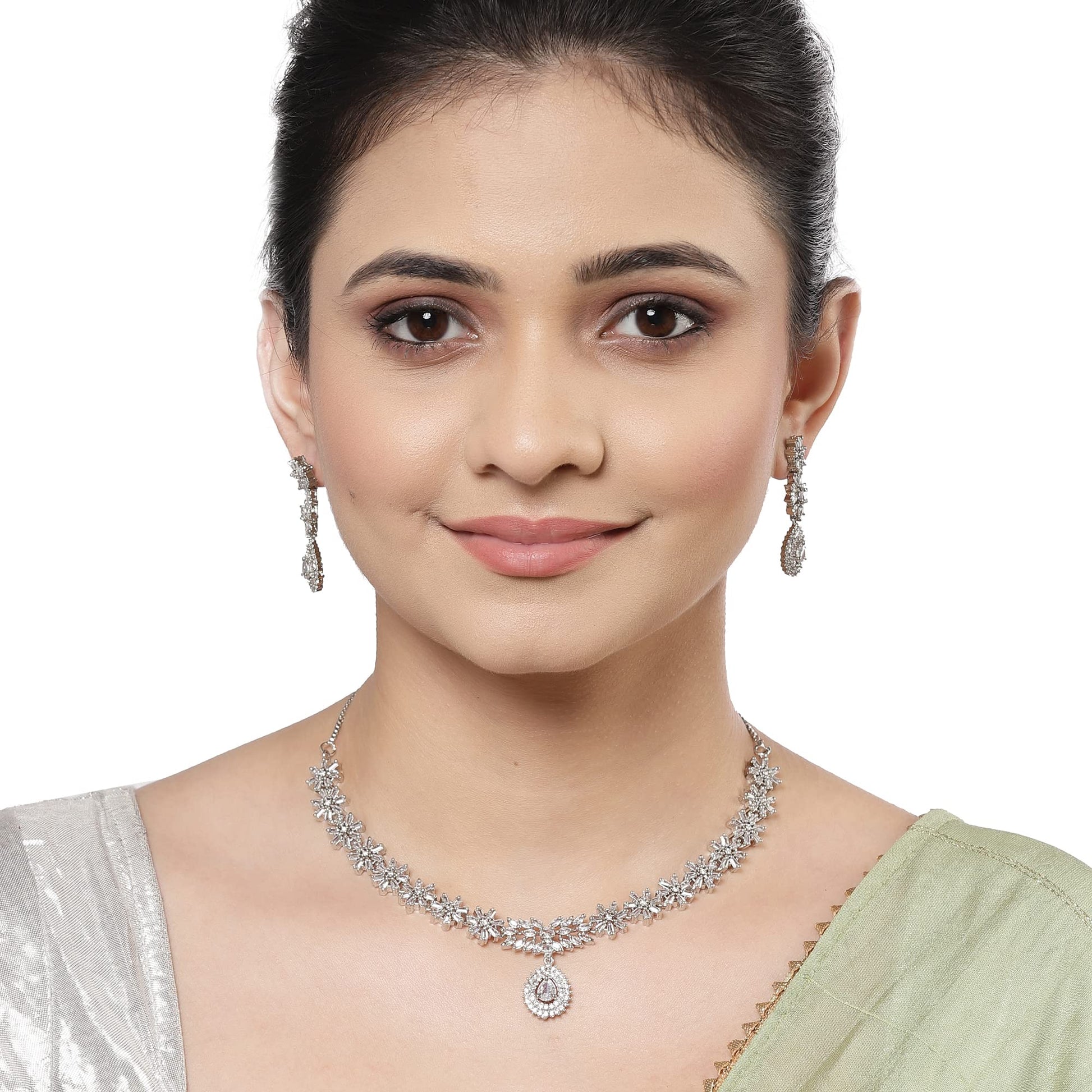 ZENEME Womens Rhodium-Plated with Silver-Toned Floral Design White American Diamond Studded Jewellery Set (White)